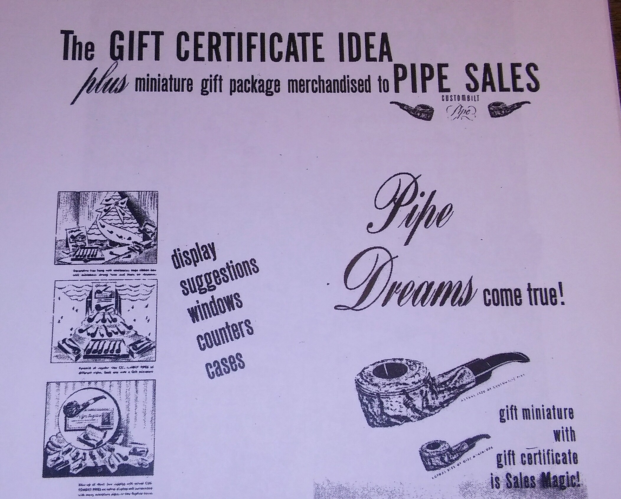This was a nice addition to my collection. Picture Christmas morning 1940’s-1950’s and this tinny box awaits you under the tree in closed a miniature Custombilt and a gift certificate from your favorite B&B . The miniature pipe and certificate would then be turned in for a full size Bilt of your choosing. They were non-smoking miniatures made of clay or wood.