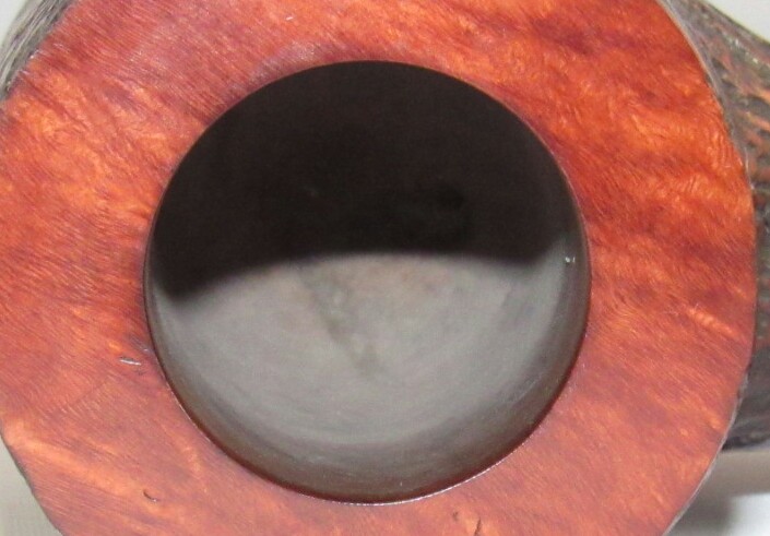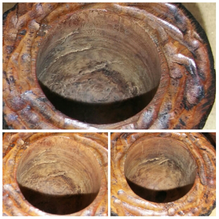 Reaming the chamber would be the first task, the chamber being on the smaller size only added to the difficulty of removing the rock hard carbon build up. When I started with the stummel I could not fit a pinky in the chamber its amazing the bowl didn’t crack under the stress. I attempted to ream the chamber with the smallest attachment that the PipNet reamer offered but to no avail the carbon was to hard and I risked damaging the rim. So I took the slow and steady approach, slowly picking away at the cake with a small pocket knife. Once I had opened the chamber a bit I tried the PipNet reamer again but the hard carbon build up was forcing an uneven cut, if I continued I would eventually dig into the briar on one side of the chamber. My third and final approach would leave the chamber free of cake, using a rotary sanding bit and variable speed drill I carefully removed the rock hard carbon I was then able to sand with 220 and 400 grit sandpaper leaving a carbon free chamber. I did uncover spider webbing along the chamber walls.
