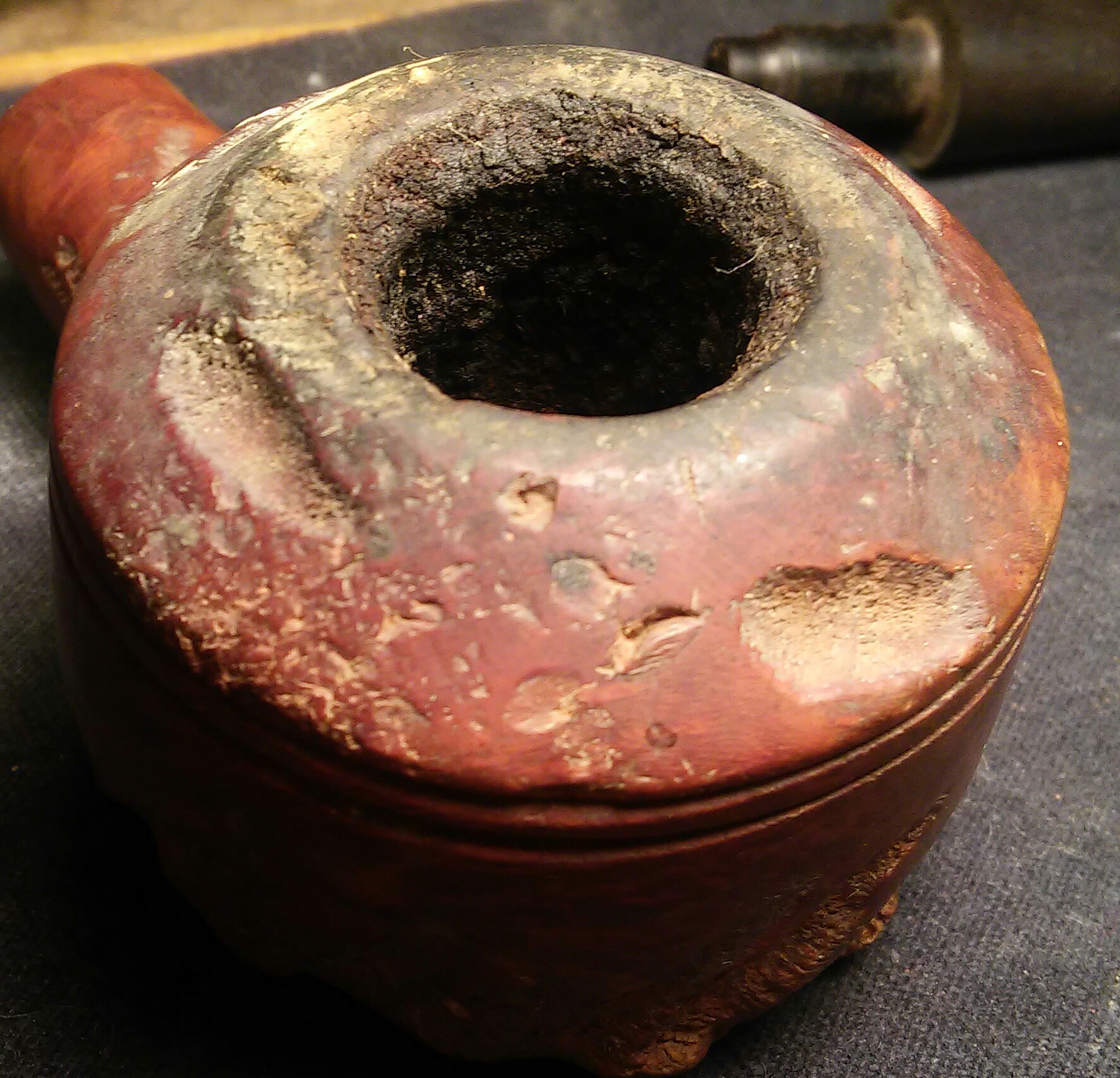 Well loved Mr.Dobbs has been sitting in a box for some time now. Made in the 1950s using scrap briar and sold at reasonable price for the average joe, it has all the look and feel of a Custombilt with the exception of the briar quality. There were many imperfections most notably the top of the bowl. It had a thick cake, worn button and what I think is paint or maybe spackle spread across the exterior of the pipe. I received this pipe in a lot a few months ago among other Custombilt lines .