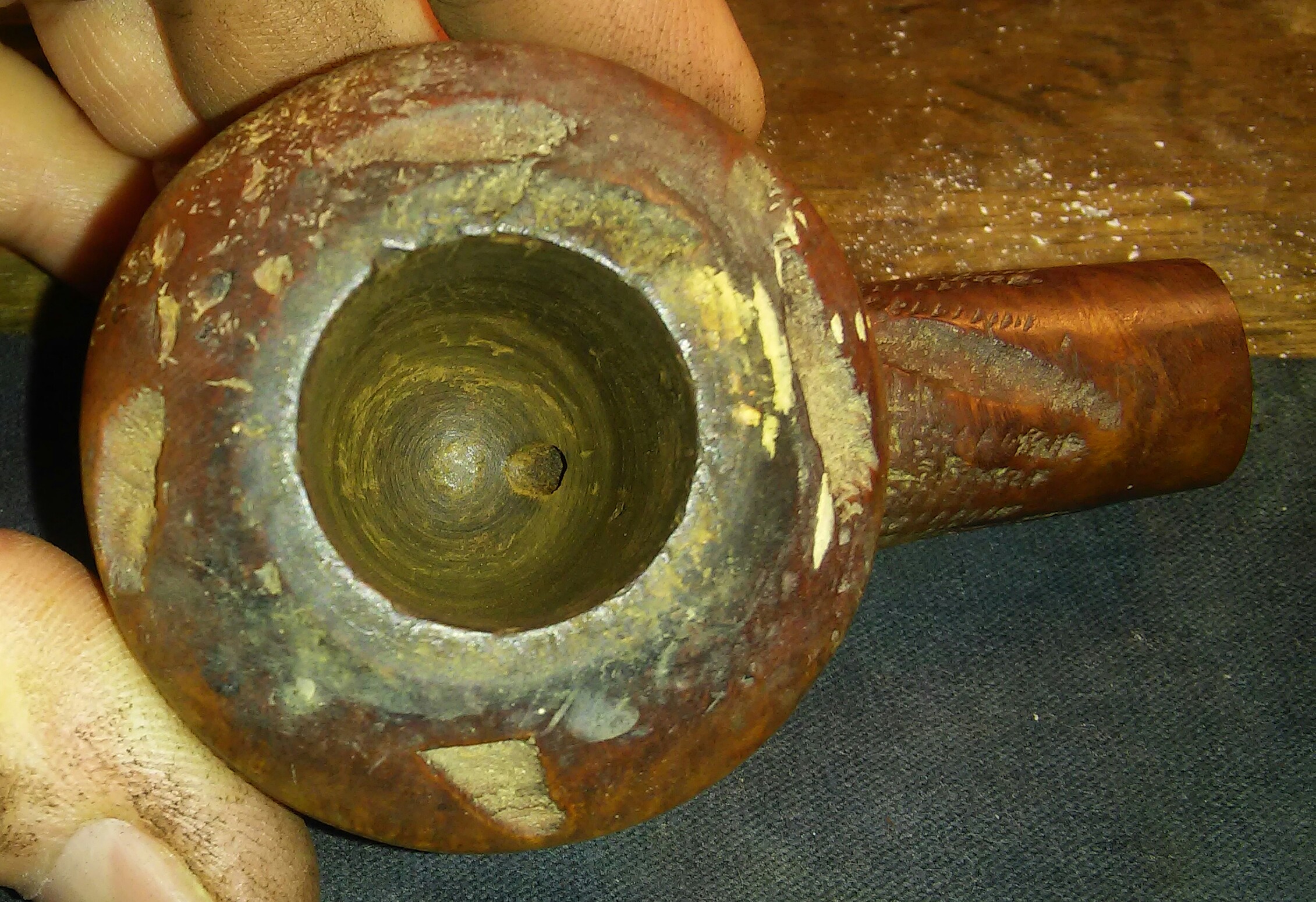The mortis and draft were heavily caked with tars and old tobacco it would need to be cleared before going any further. I un-rolled cotton balls and twisted them together to form a long swab. Using the swab I turned it tightly into the mortise and then filled the chamber with a little EverClear and waited for the alcohol to be absorbed. Letting it soak for a bit, I removed the swab and cleaned the mortise / draft with stiff pipe cleaners and shank brush until the draft was clear.