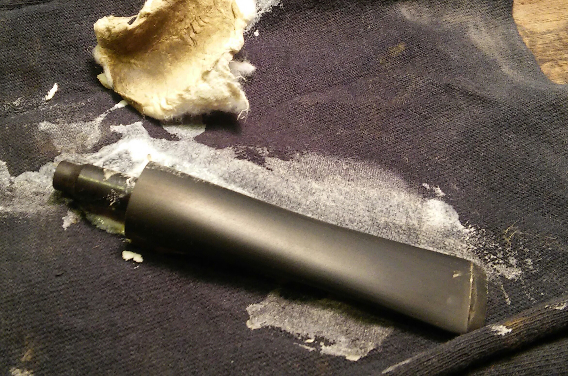 The chamber looked as if someone may have used a pocket knife in the past to remove the cake from it the edges were gouged . Using 220, 400 and 1000 grit paper around a finger I worked carefully at the top of the chamber to remove the gouging,