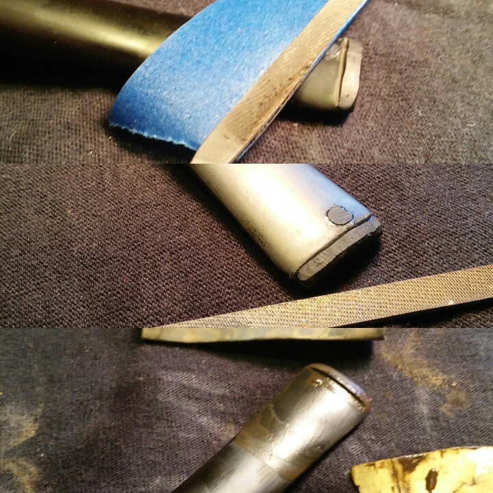 The following day after curing overnight I began forming the new button, using needle files and 400 grit sandpaper. I tapped off the bottom side of my needle file so I could get the file flush against the new button. I then sanded the stem with 1000 grit sandpaper to remove the file marks.