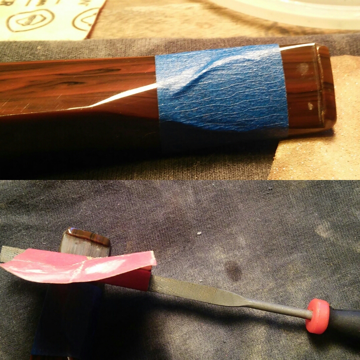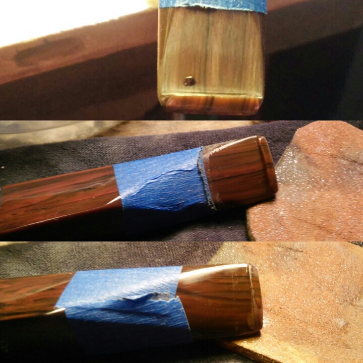 I tapped off the stem with painters tape so my work on the bit/lip area would remain in one spot, the rest of the stem was in good condition there was no need to make more work for myself. I wrapped 400 grit paper around a flat needle file and wet sanded the area of the impressions.