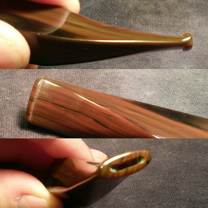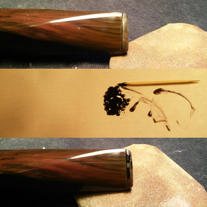 I started with the button, sanding the area with a 1500 micro mesh pad and then wiping down with EverClear. I mixed a paste of CA glue and activated charcoal powder to apply to the worn button. I used less activated charcoal powder then normally because of the cumberland stem, I didn’t want one big dark spot. I applied little dots of the paste with a toothpick and then sprayed it with accelerator and left it to dry.